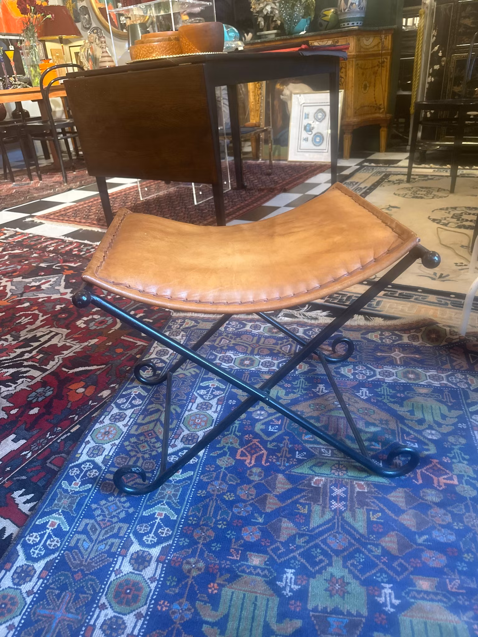 Pall/taburett med underrede i järn och skinnklädd sits. Modern design från 2000-talet.