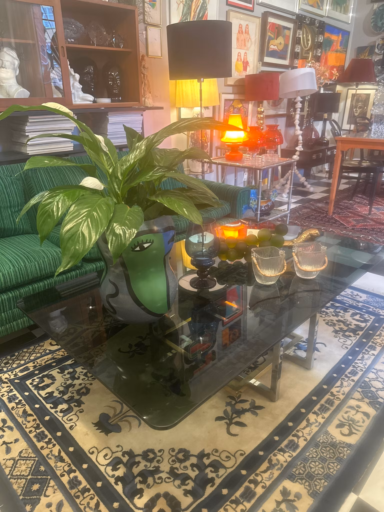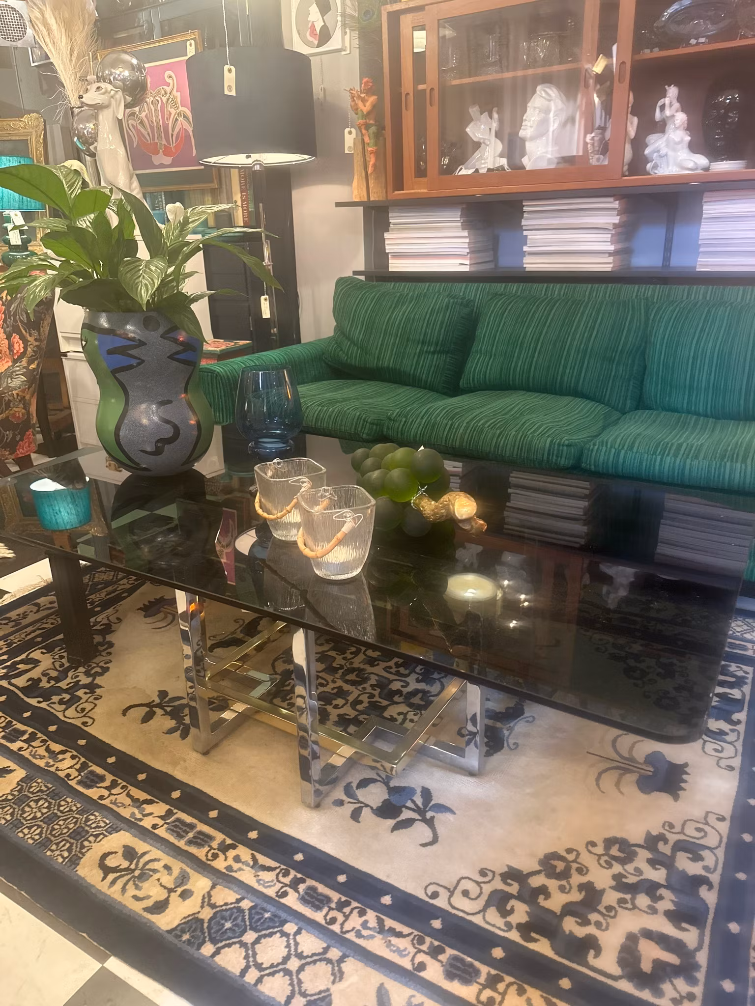 Elegant soffbord från 1980-talet med röktonad glasskiva och stabilt metallunderrede. Modern och stilren design.