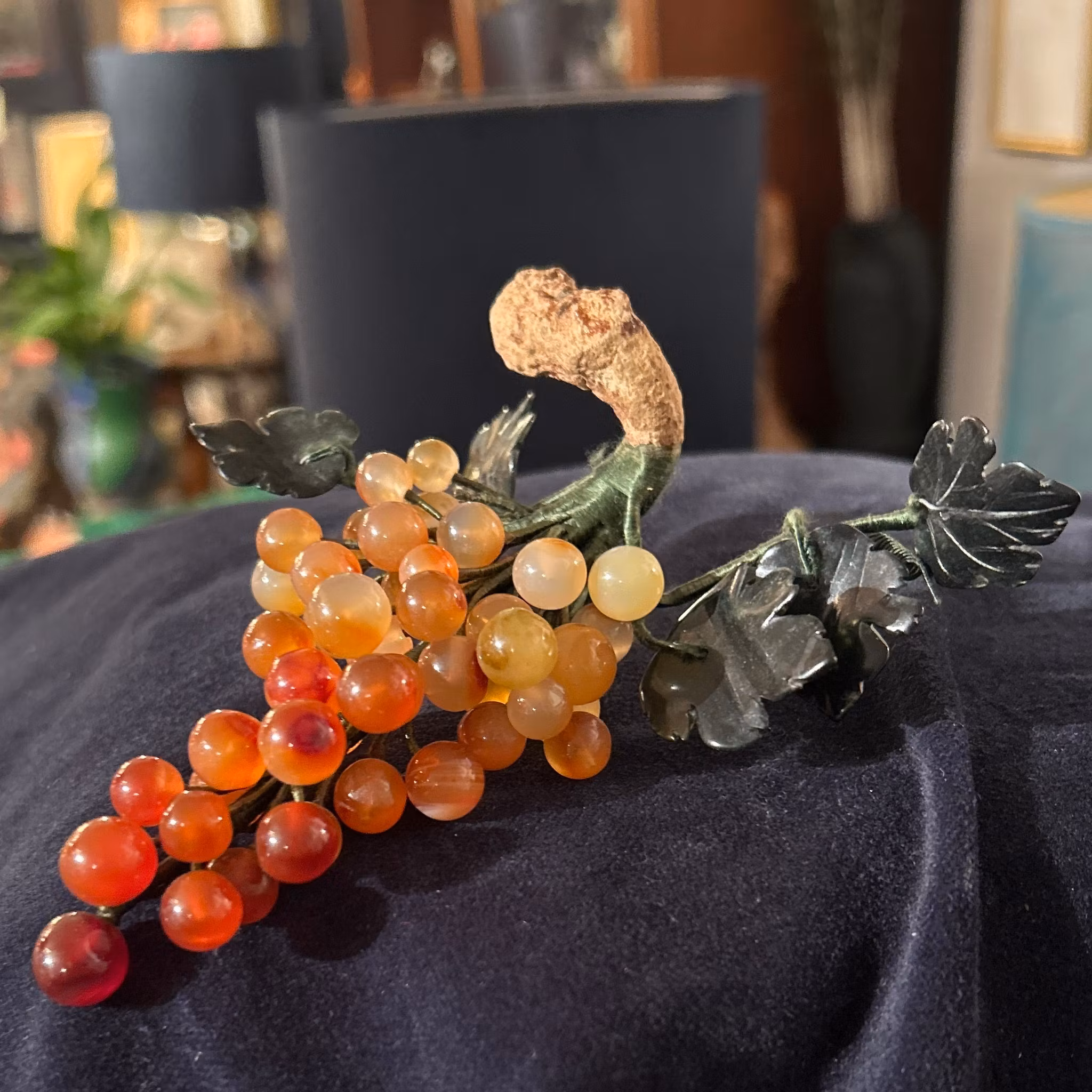 Prydnadsdruvor med bärnstensfärgade stenar och glas med en träkvist. Italien ca 13 cm
