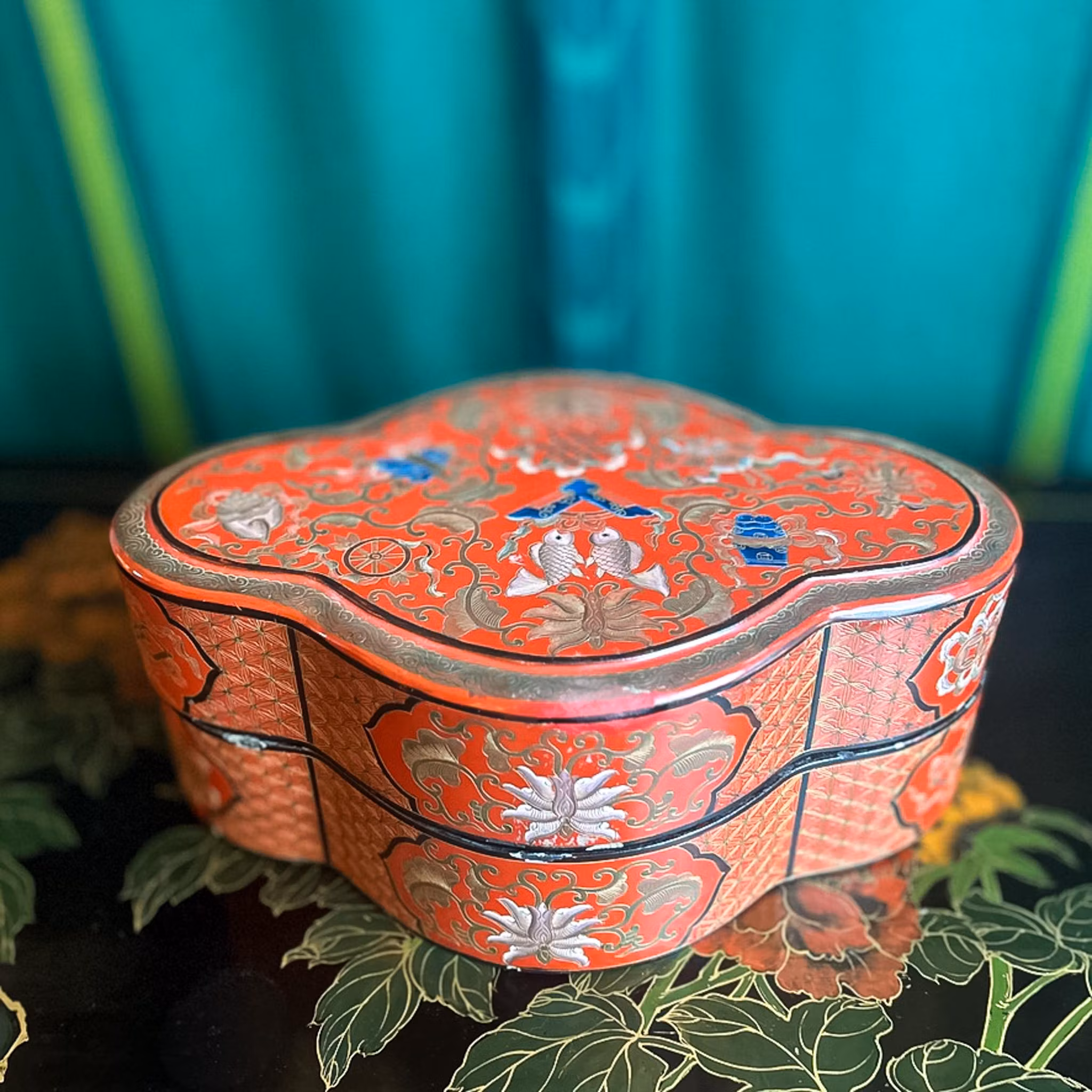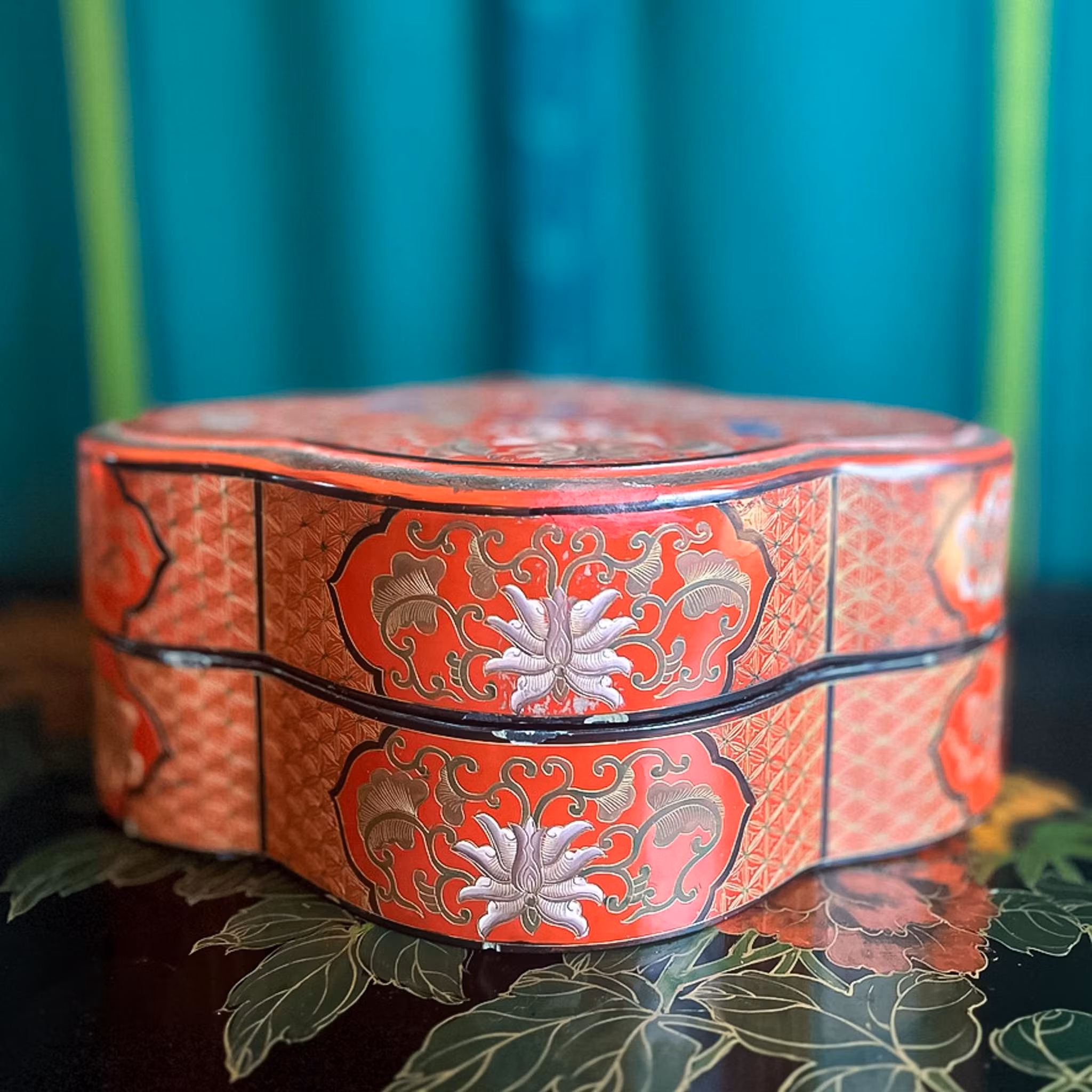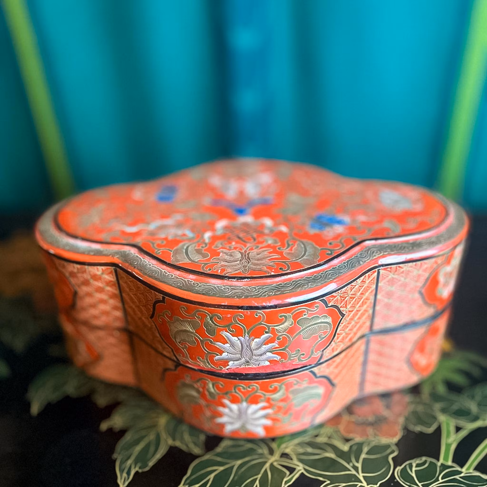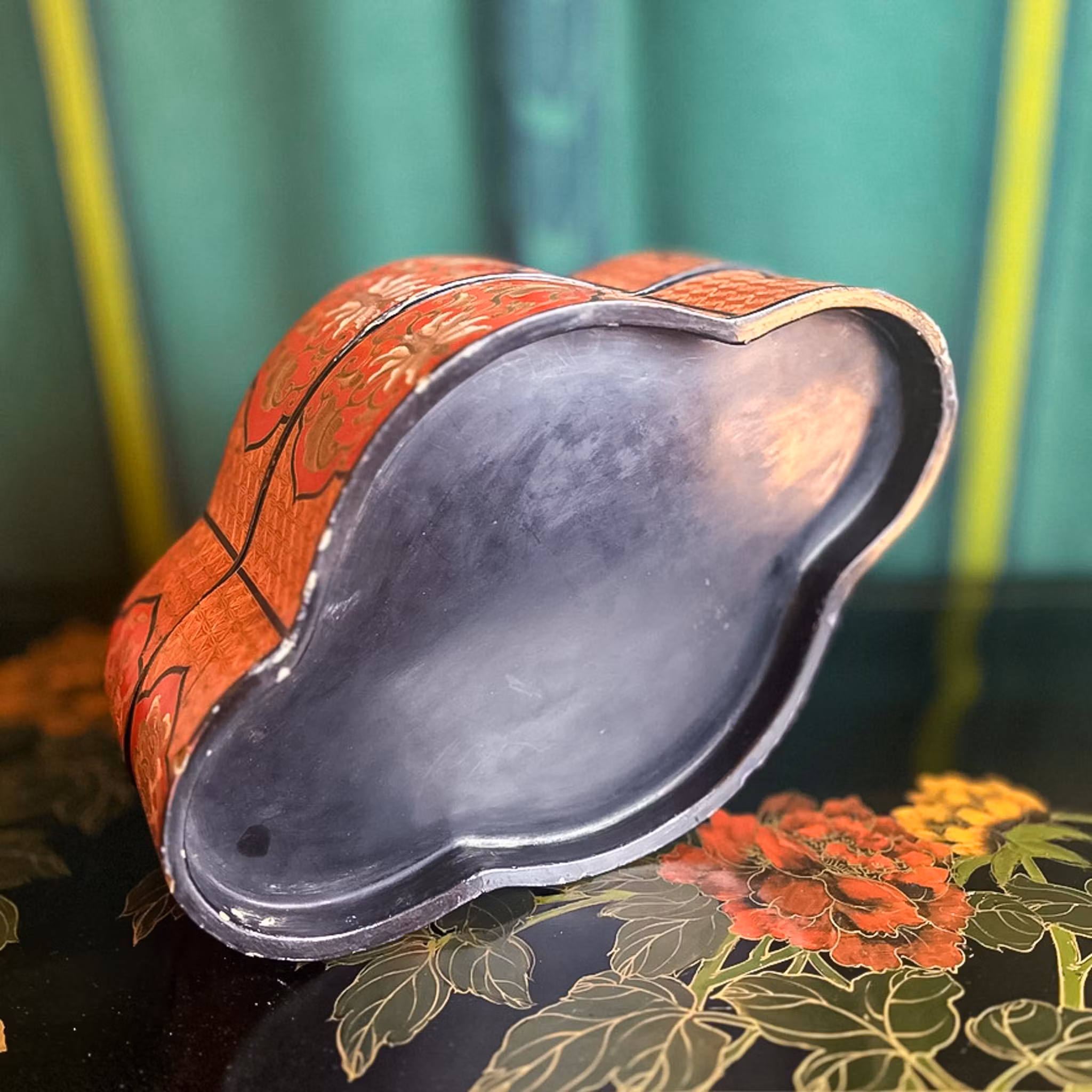 Lackask med dekorativ orientalisk design. Mått: 36x24x14 cm.