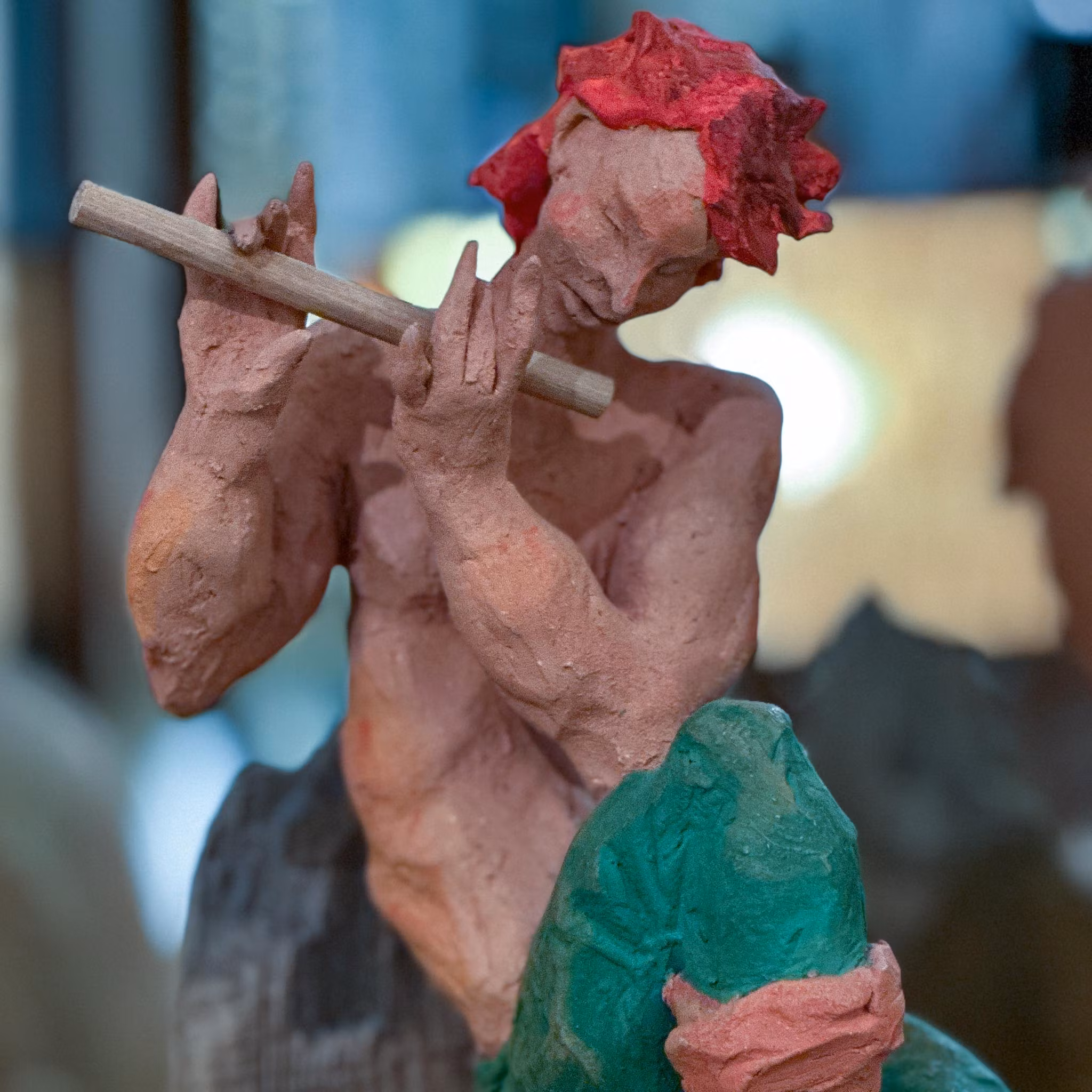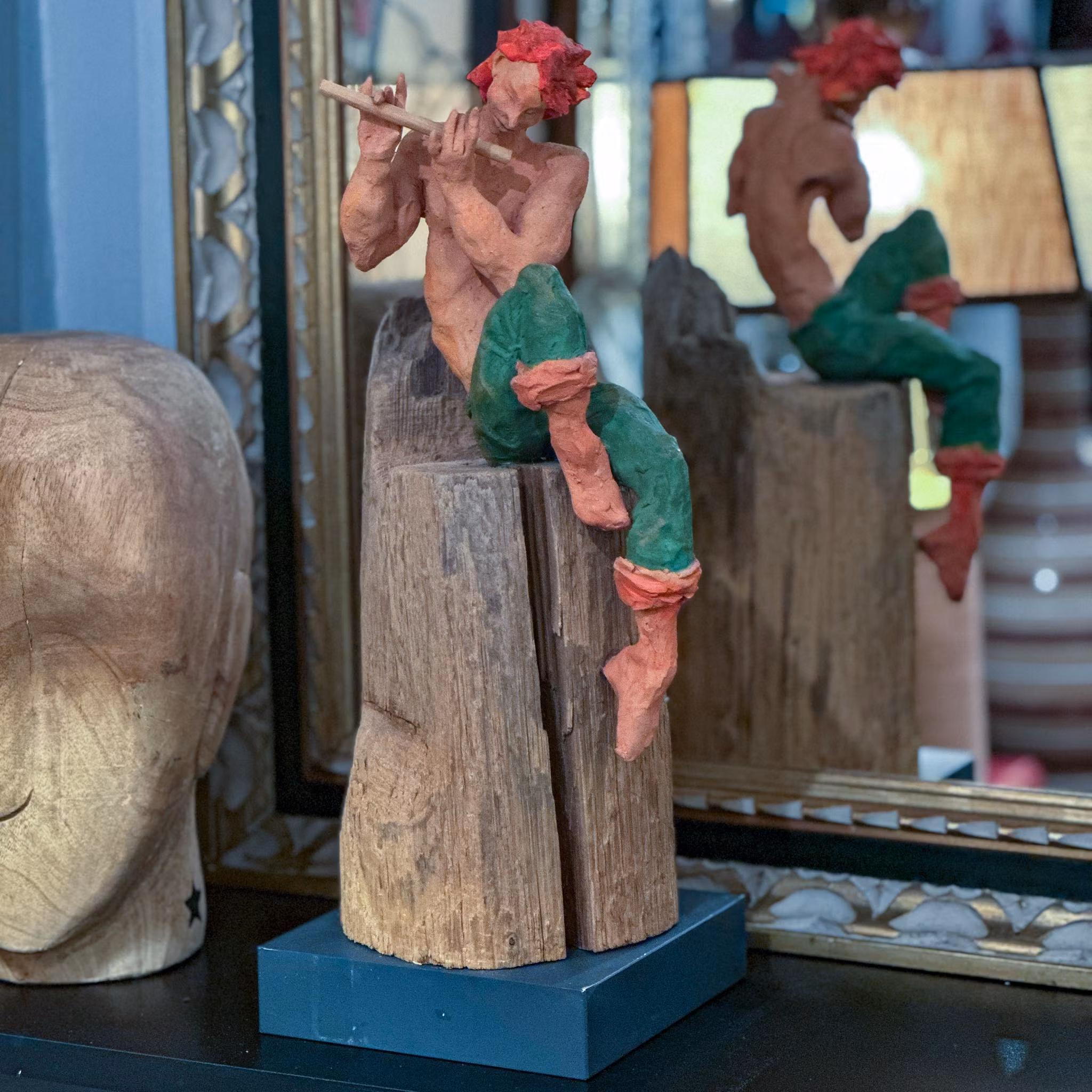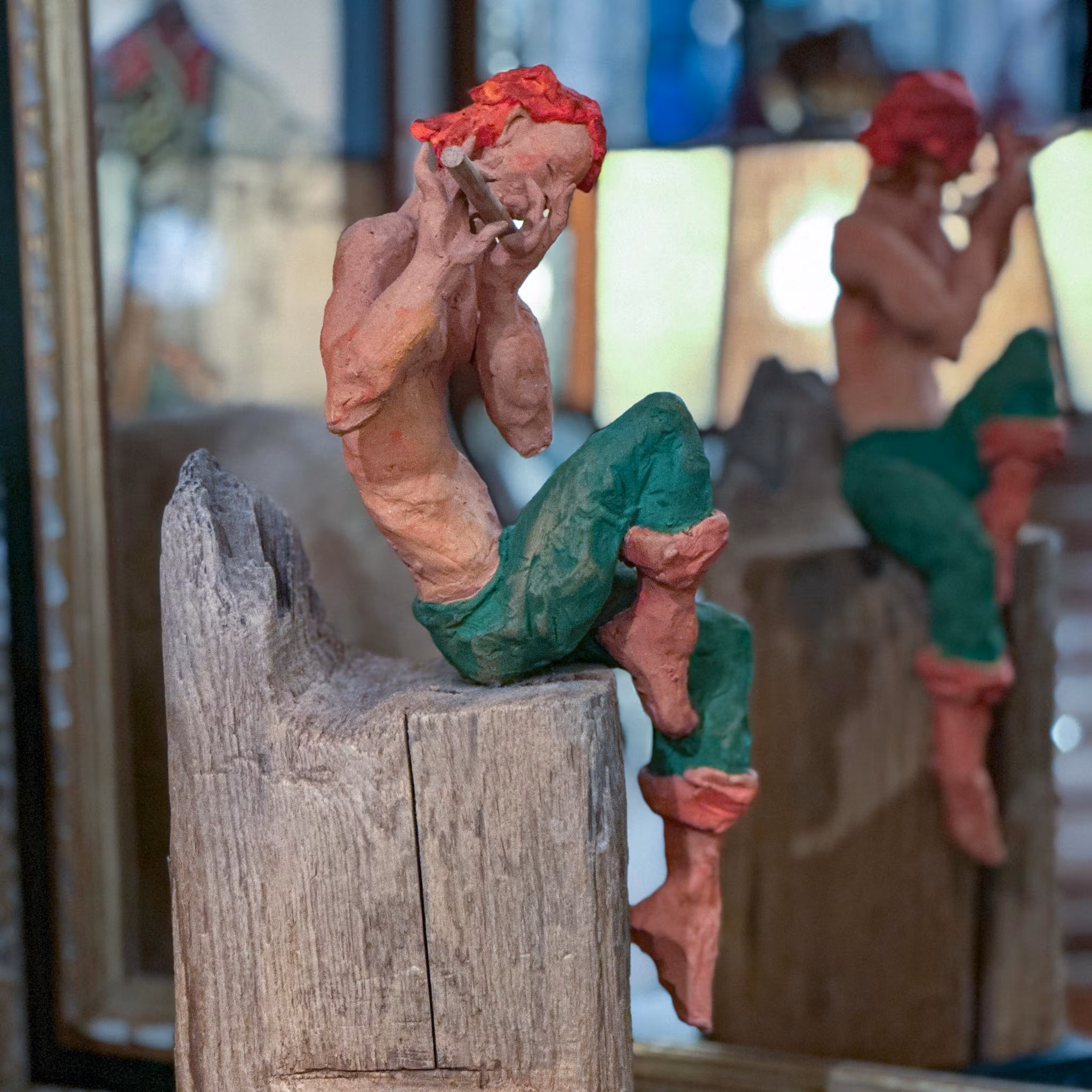"Näcken" eller "Flöjtist på stubbe", signerad skulptur i bemålat lergods på träsockel. Höjd: 40 cm.