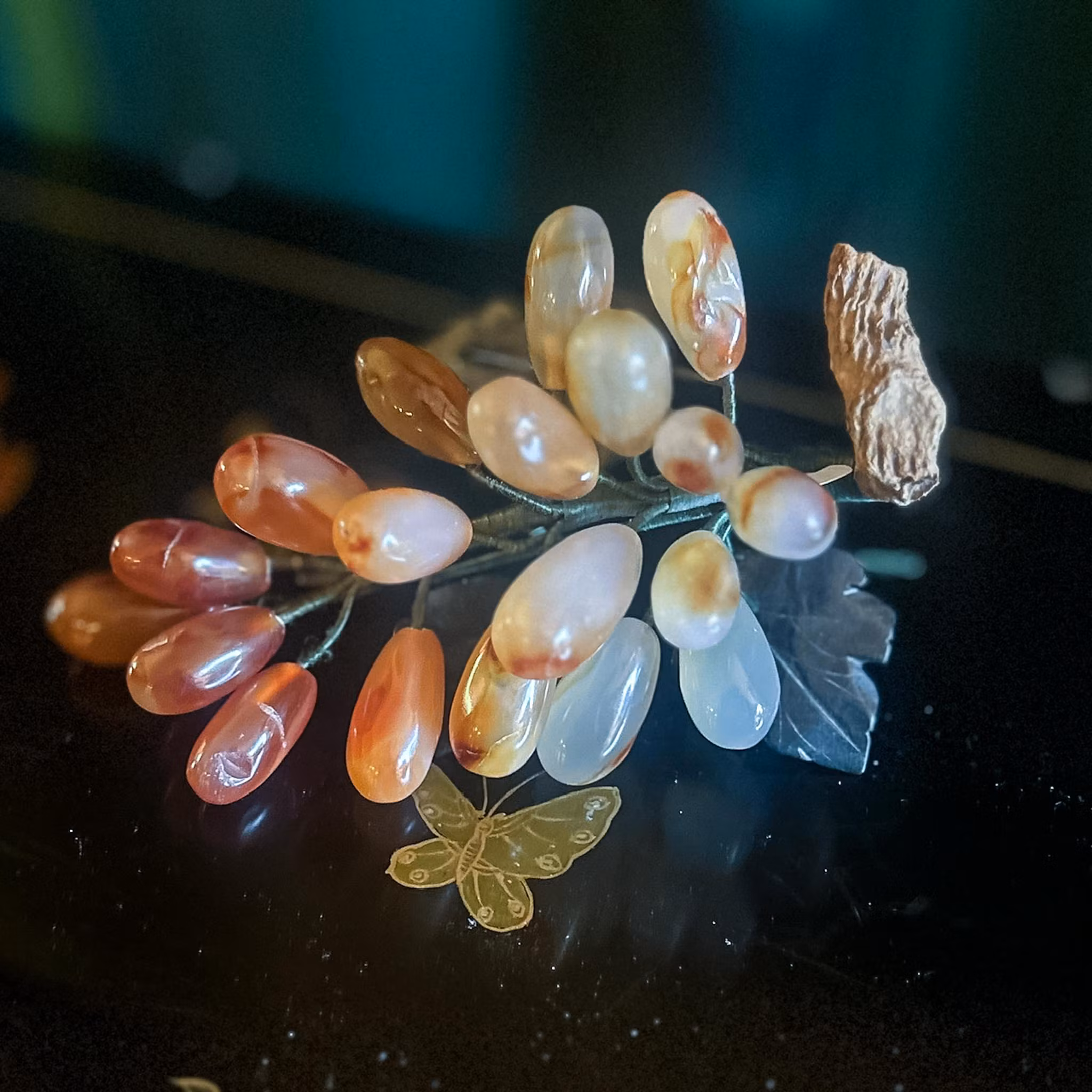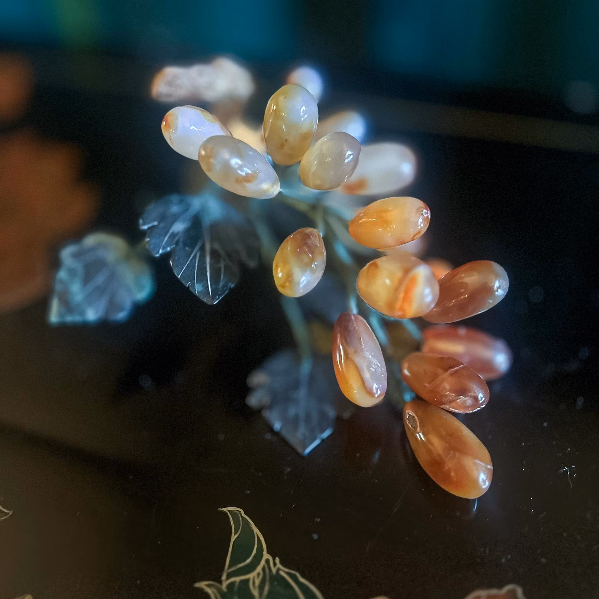Bordsdekoration i stenigas och trä.Ljusa bärnstenstoner. Ca 20 cm