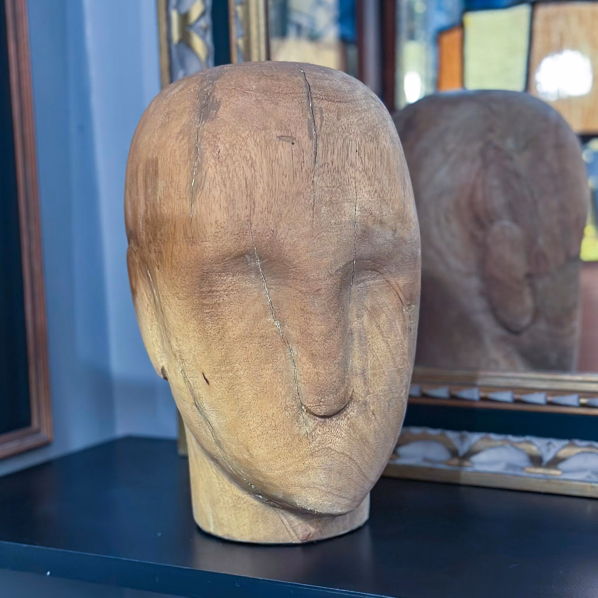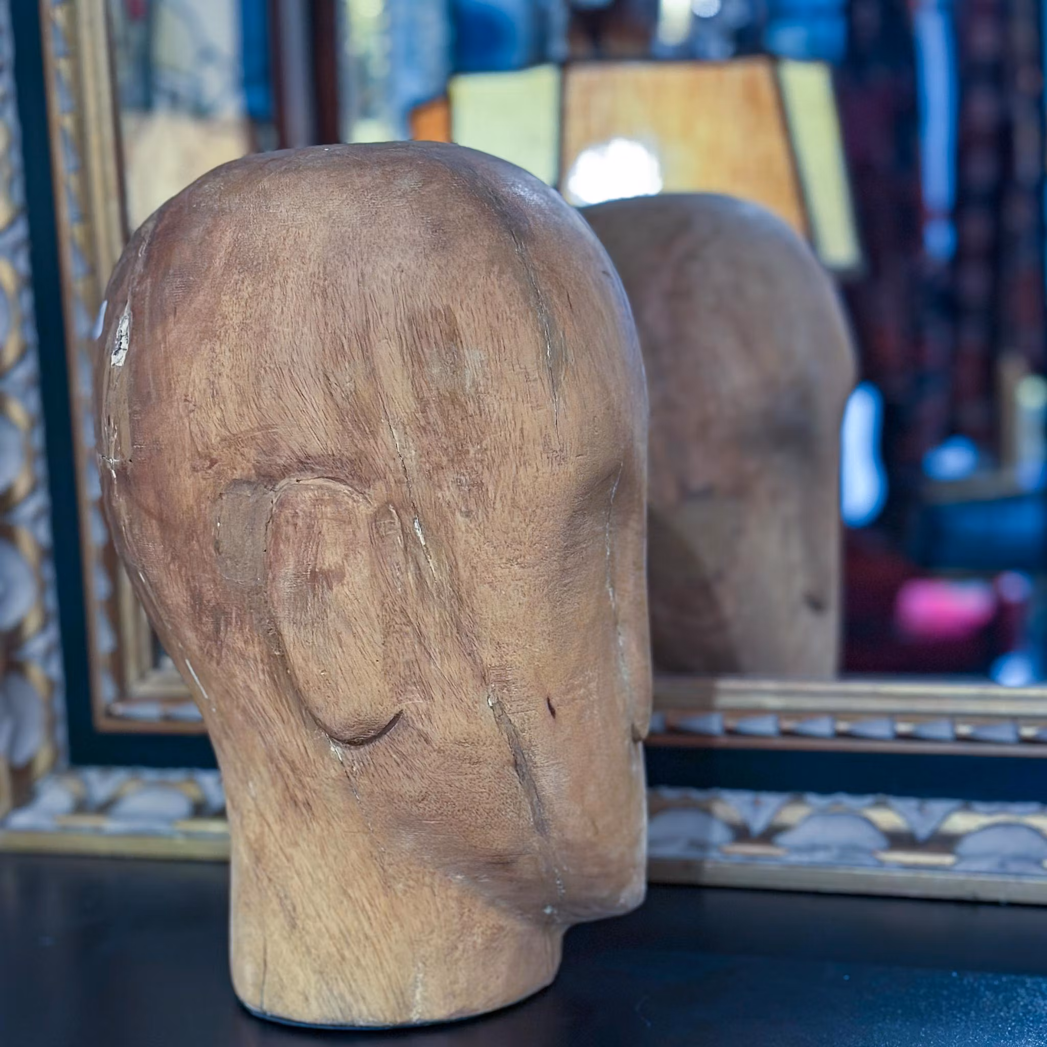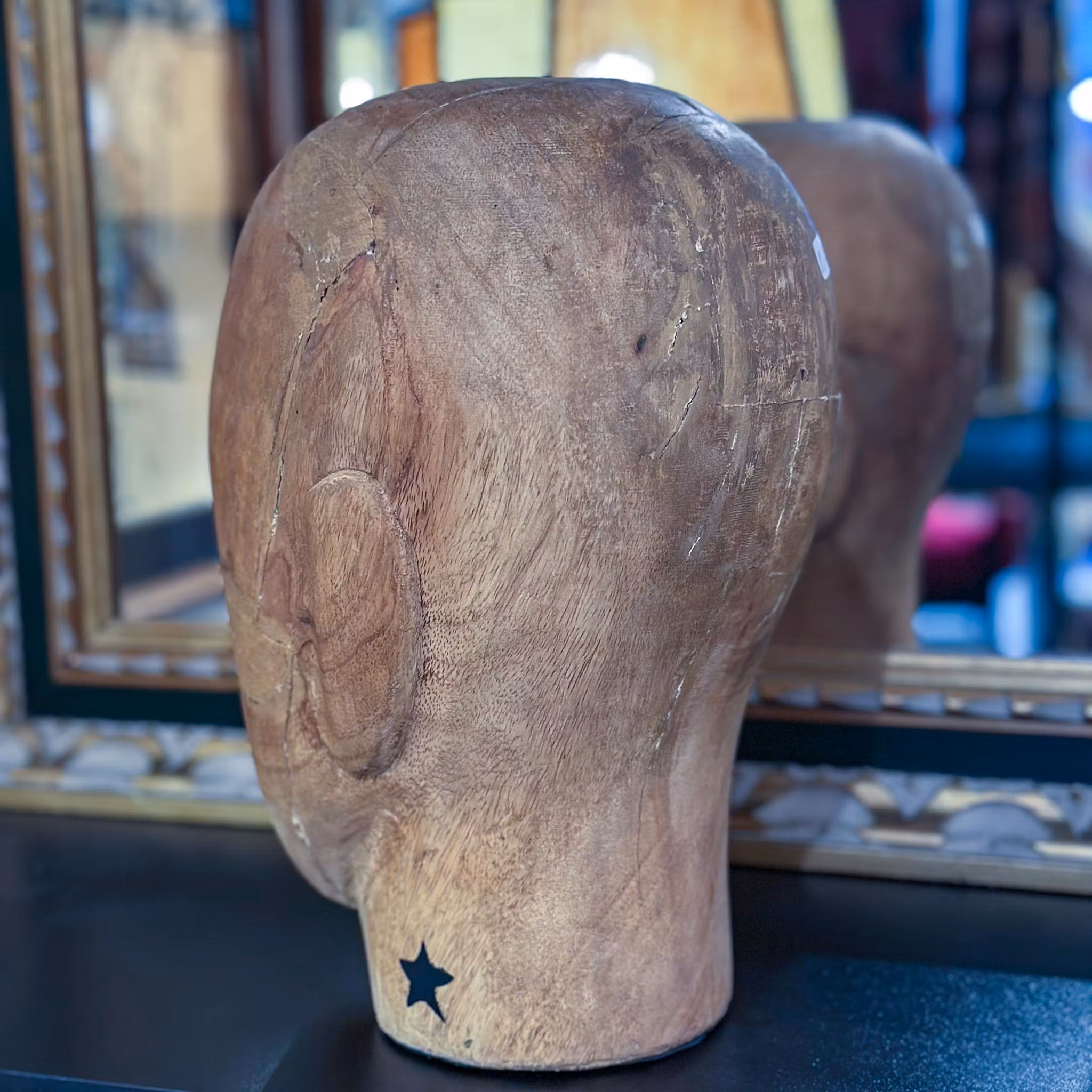 Träskulptur av ett huvud, höjd: 30 cm. Användes av modister i början på 1900- talet