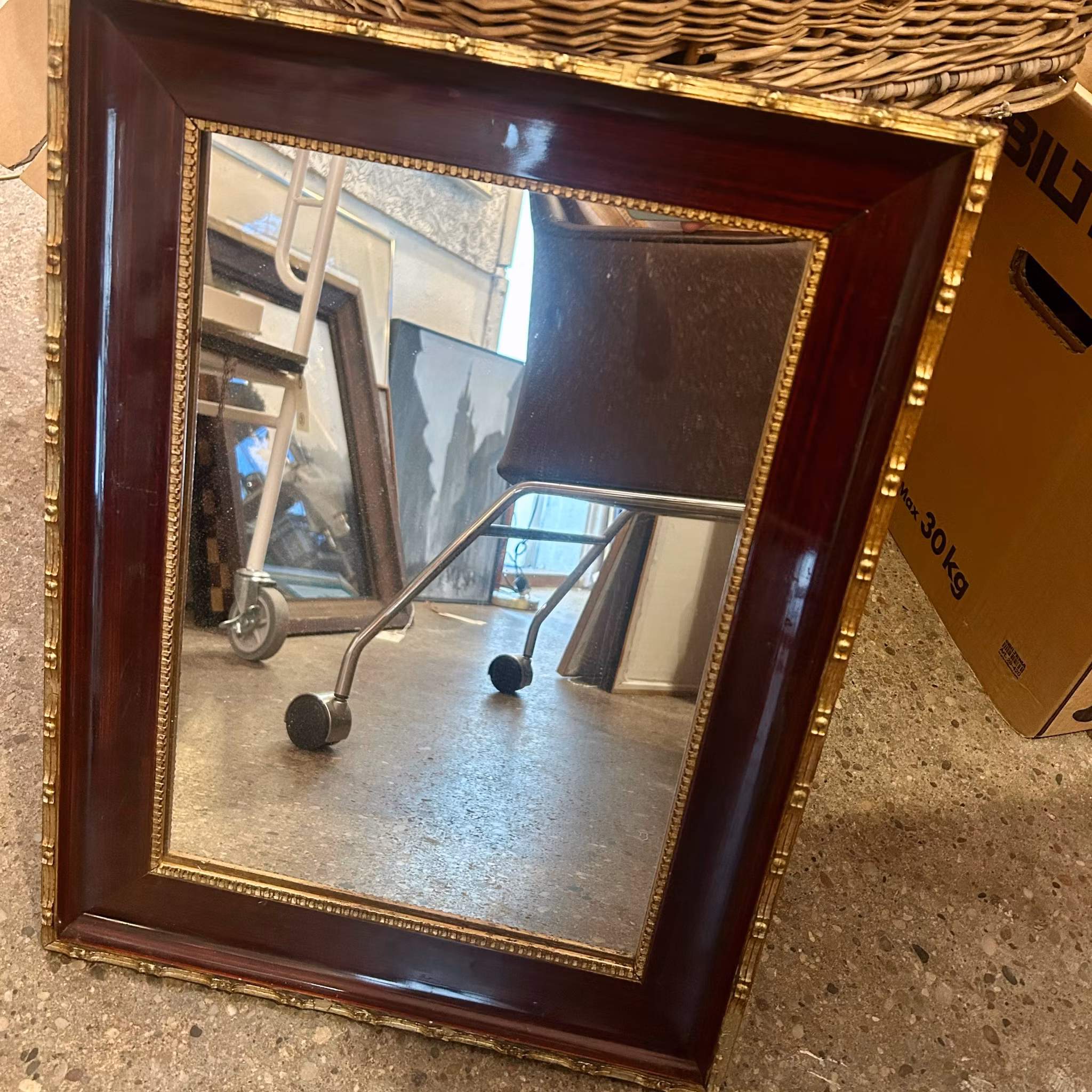 En ram i vinrött och guld med spegelglas. Mått: H:54 cm B:40 cm. Smärre bruksslitage på ramen med några små bortfall.