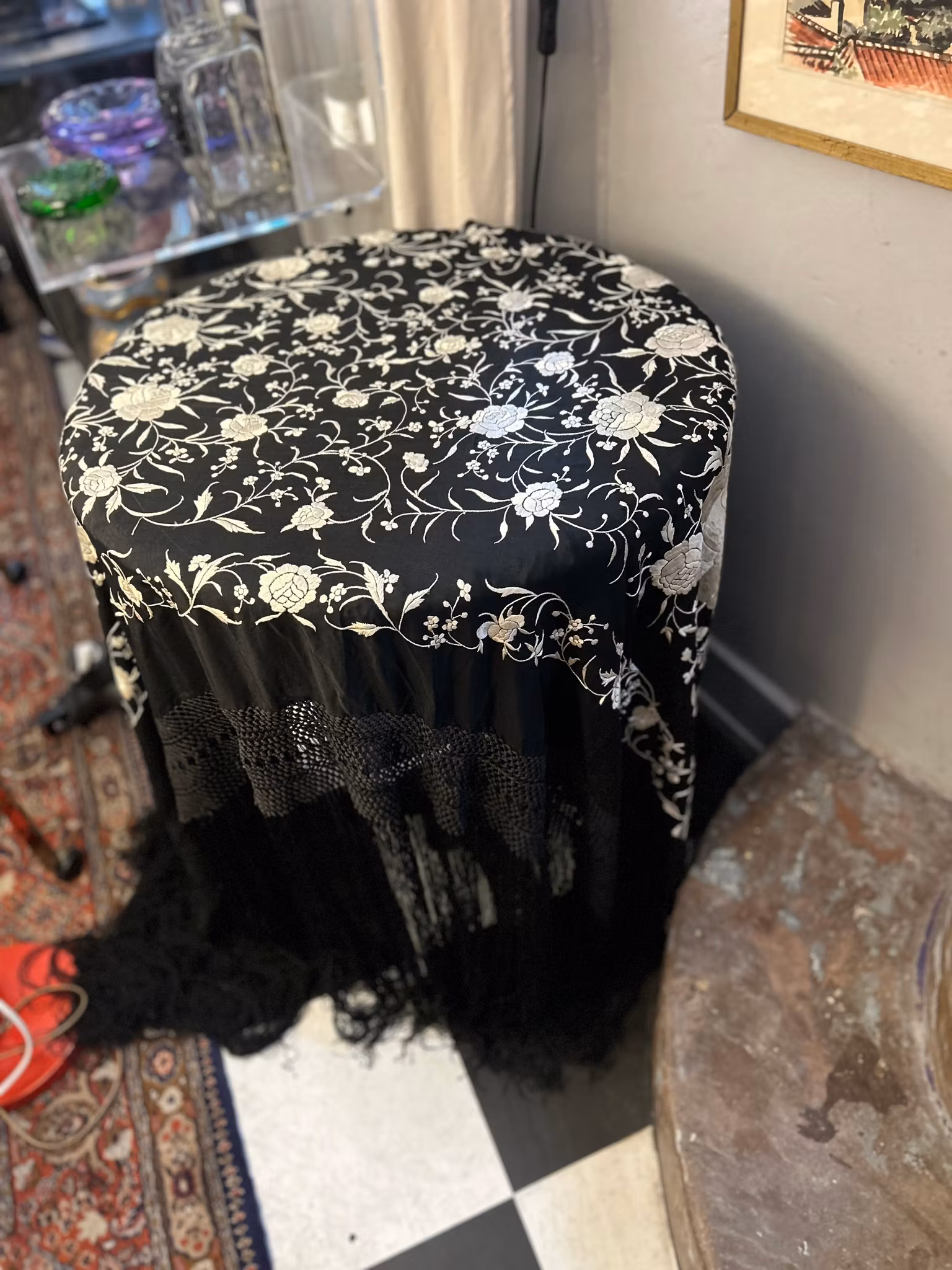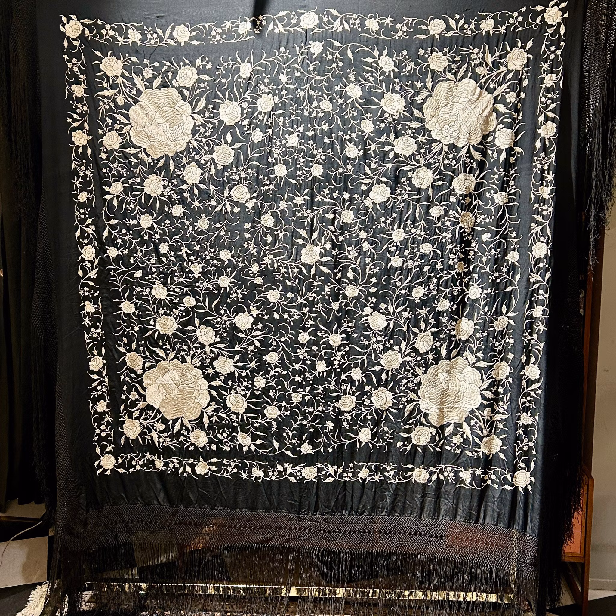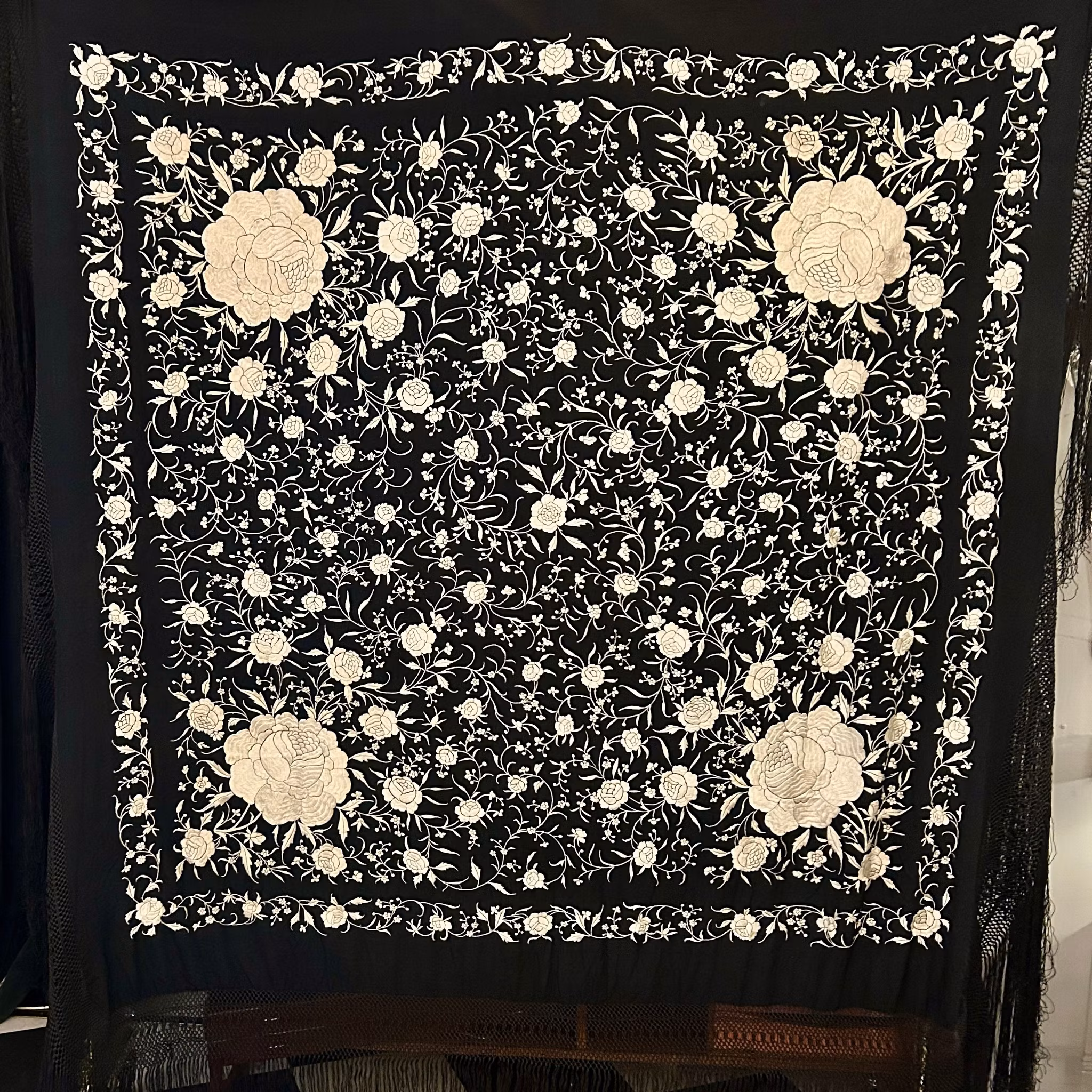 Broderad flygelduk i svart siden. Längd: 158 cm, höjd: 155 cm.